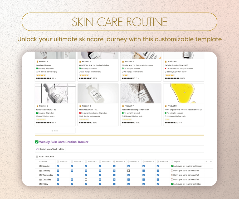 Keep tabs on your skincare products, track their usage, and create a personalized skincare calendar to monitor your progress. Our template makes it easy to care for your skin and your overall well-being.