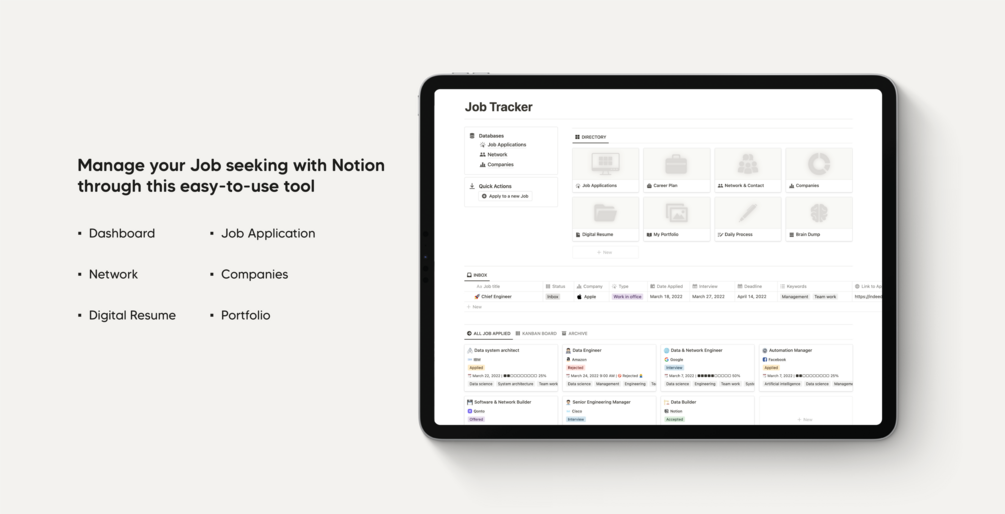 The Job Tracker Notion template is your all-in-one career management system, designed to:
