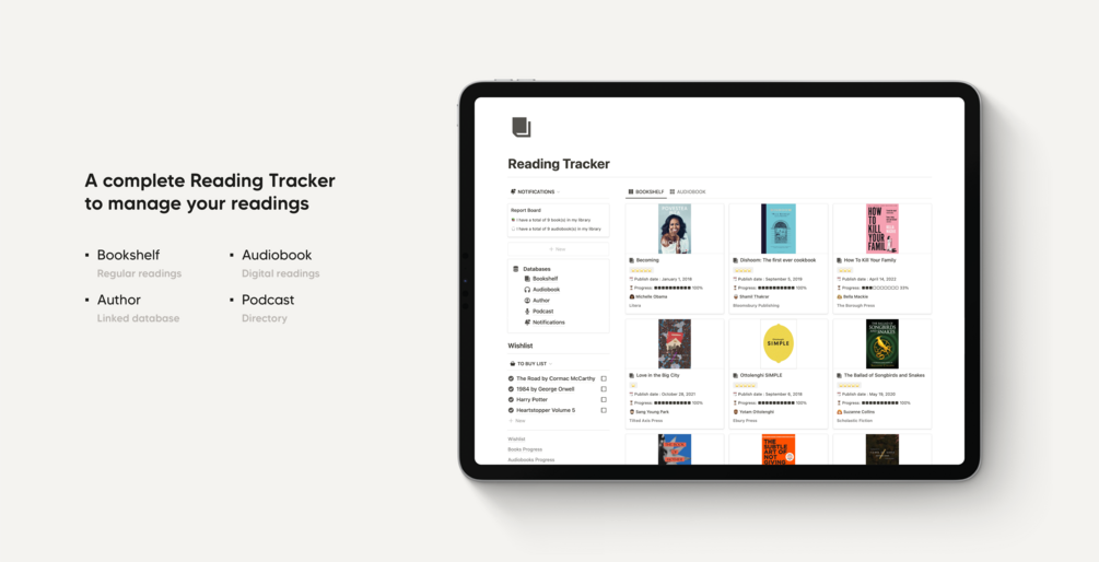 Embark on an exciting adventure through the world of books with the Reading Tracker Notion template. Perfect for readers who want to stay organized, track their progress, and immerse themselves in a world of stories and knowledge. Whether you're a bookworm or just looking to stay on top of your reading goals, this tracker is designed to elevate your reading experience.